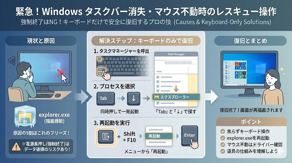 PCを使っていて、突然画面下のタスクバーが消えてしまった。 それどころか、デスクトップのアイコンも表示されず、マウスカーソル(矢印)すら動かない、あるいは消えてしまったという経験はないでしょうか? 画面が真っ青(あるいは真っ黒)になり、操作... Uncategorized