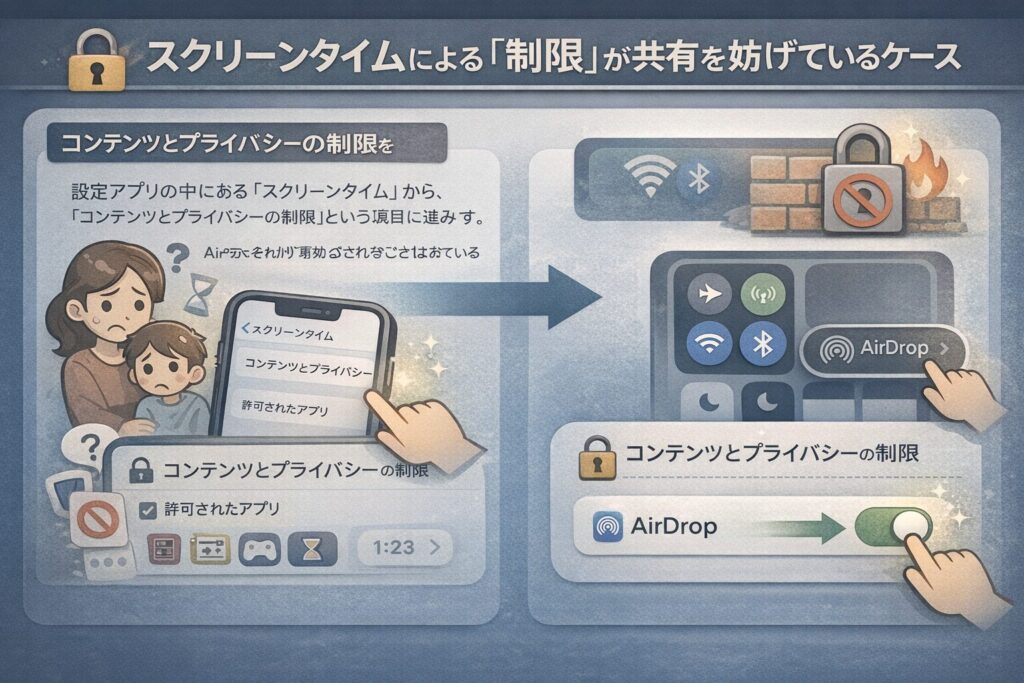 特に家族間でiPhoneを利用している場合や、子供の端末に制限をかけている場合、AirDropそのものが無効化されていることがあります。