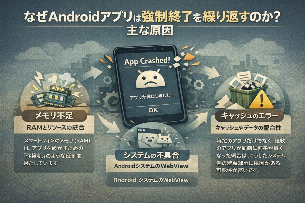 この記事では、現役のITインフラエンジニアである私が、技術的な根拠に基づいた「Androidアプリが強制終了する原因と具体的な対策10選」を初心者の方にも分かりやすく解説します。