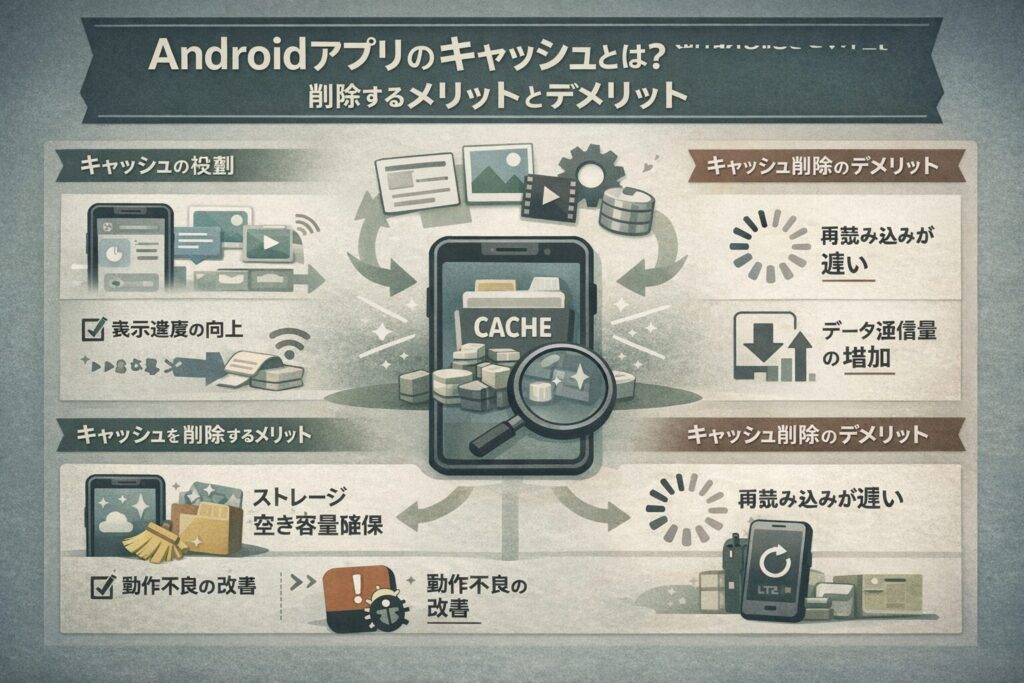 Androidにおける「キャッシュ」とは、アプリが一度読み込んだデータを一時的に保存しておく仕組みのことです。