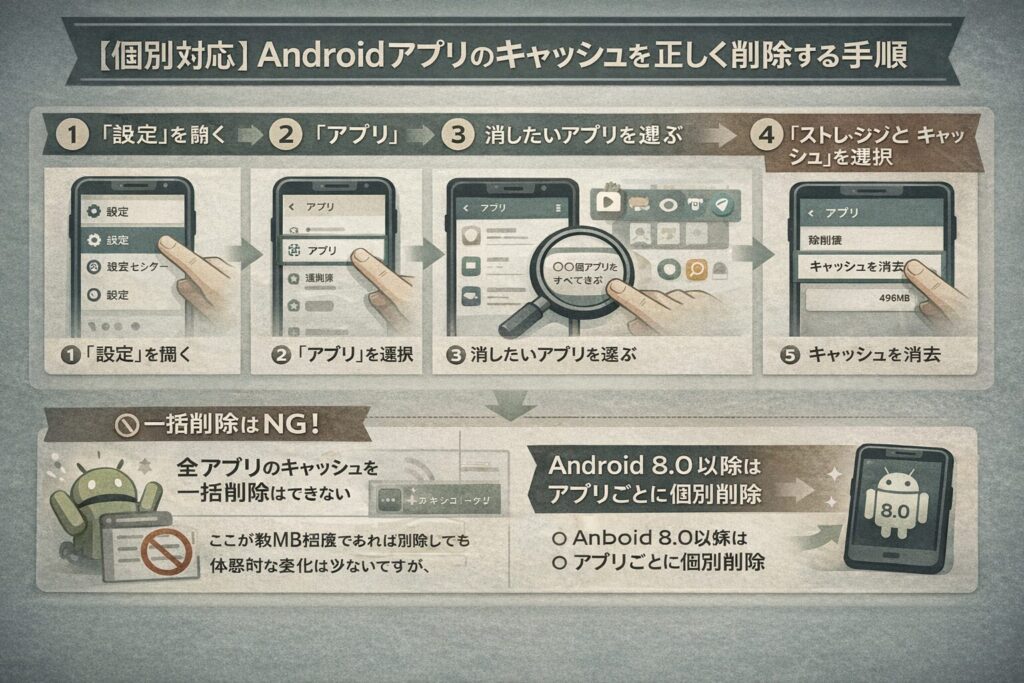 以前の古いAndroid OSでは、設定画面からすべてのアプリのキャッシュを一括で削除する機能がありましたが、現在の最新OSでは「アプリごとに個別に削除」するのが標準的な仕様となっています。
