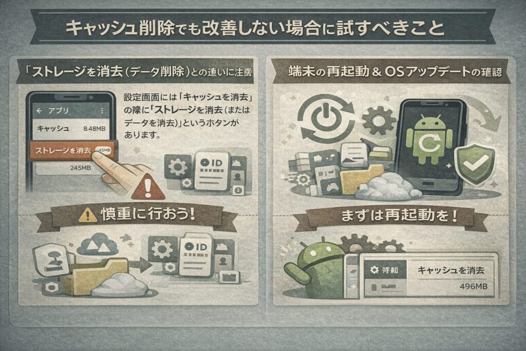 「キャッシュを消去」は一時的な表示用ファイルを消すだけですが、「ストレージを消去」はそのアプリのすべての設定、ログイン情報、セーブデータなどを完全に削除します。