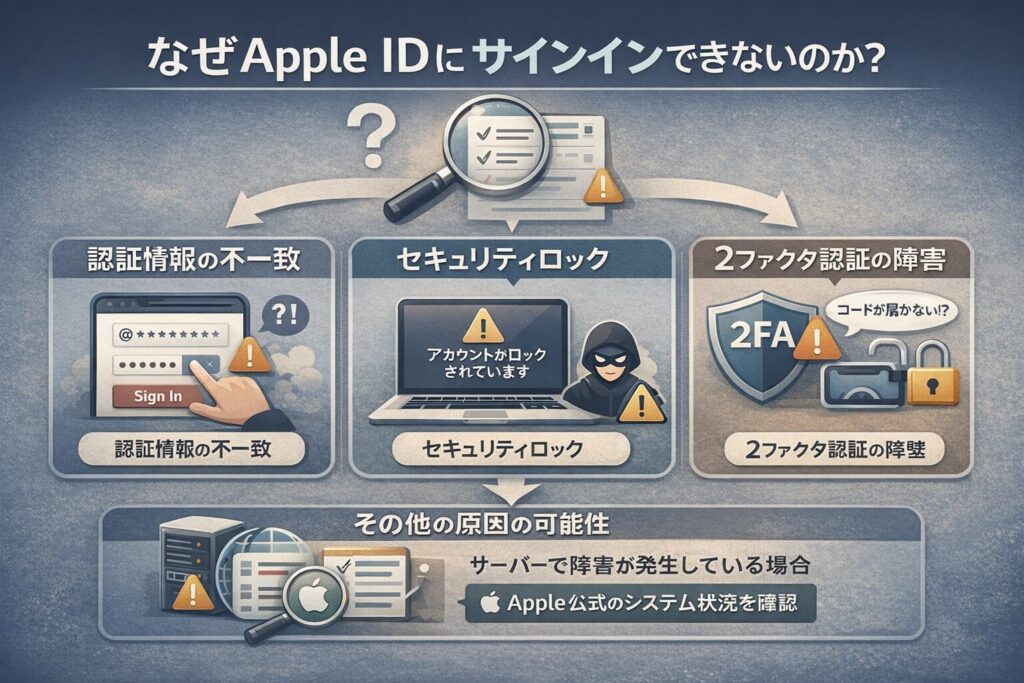 サインインできない原因は、大きく分けて「認証情報の不一致」「セキュリティロック」「2ファクタ認証(2FA)の障壁」の3つに分類されます。