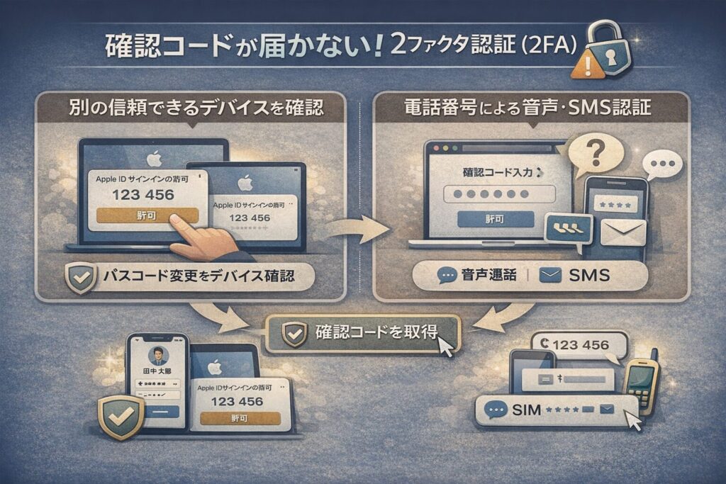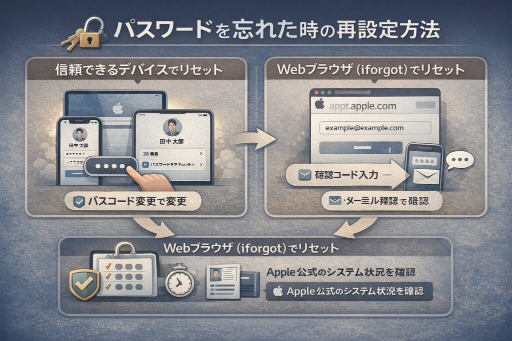 まずは「信頼できるデバイス」の有無を確認し、次に「iforgot」によるパスワードリセットを試みてください。
