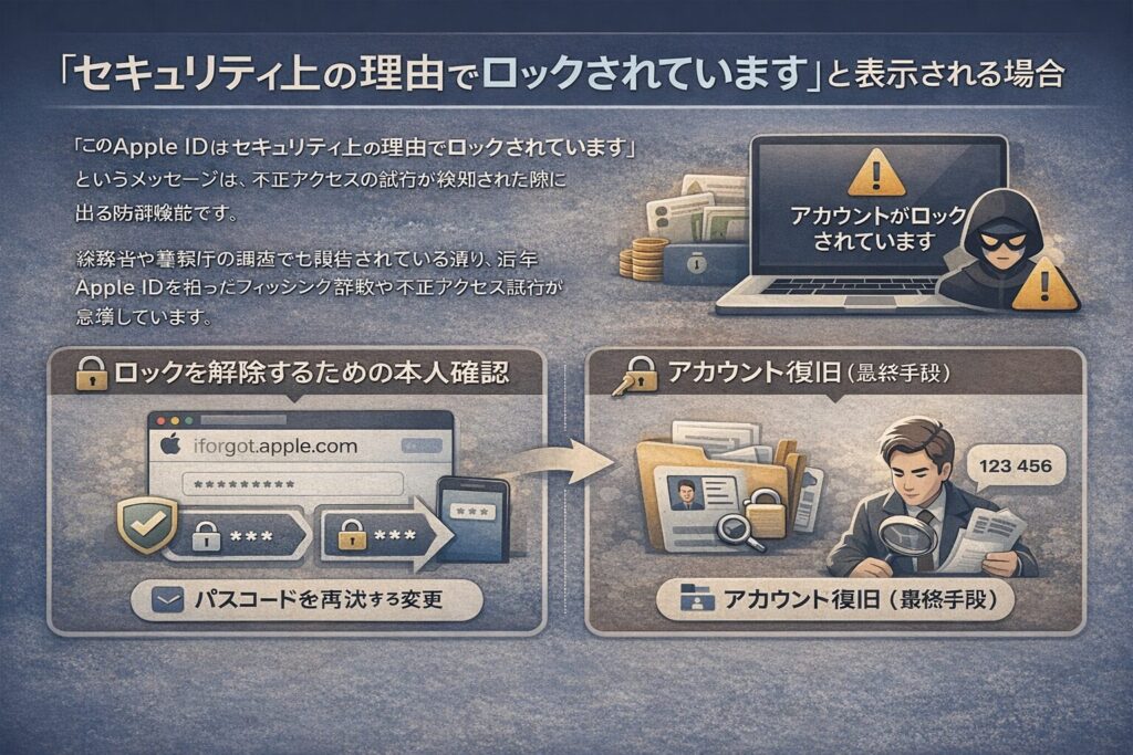 「このApple IDはセキュリティ上の理由でロックされています」というメッセージは、不正アクセスの試行が検知された際に出る防御機能です。