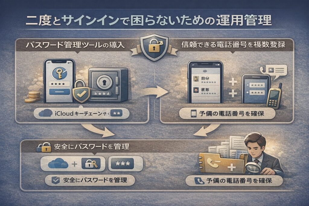 iCloudキーチェーンや、信頼性の高いサードパーティ製のパスワード管理ツールを利用し、安全に情報を保管することを強く推奨します。