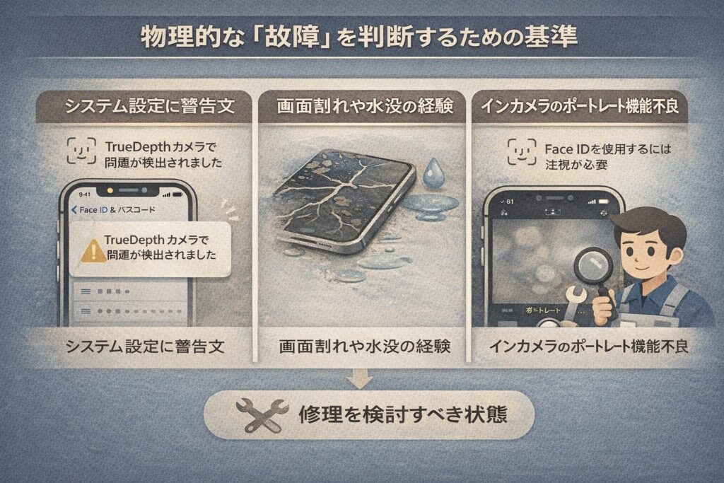 この場合は、設定アプリ内に「Face IDの問題が検出されました」という警告が表示されることが多く、ユーザー自身での修復はほぼ不可能です。