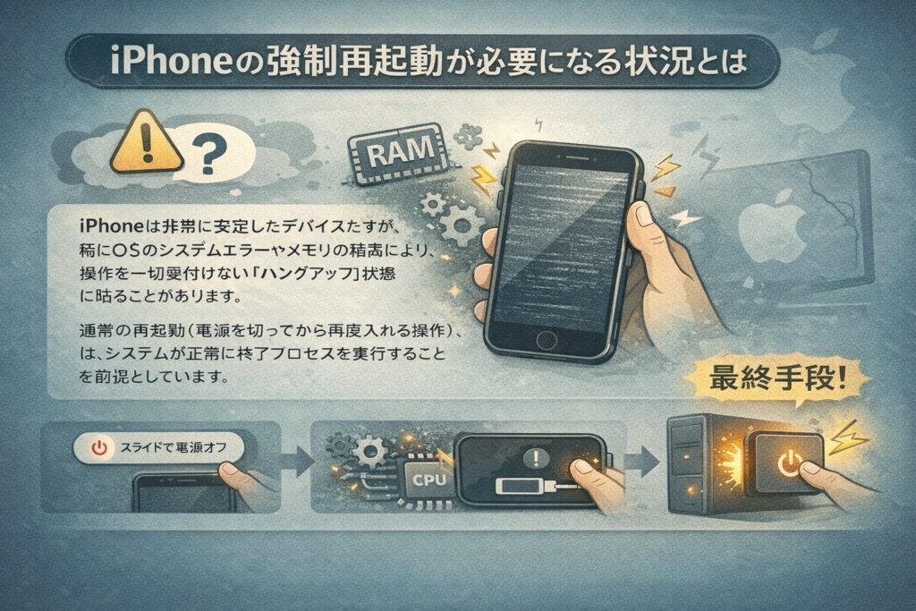 iPhoneは非常に安定したデバイスですが、稀にOSのシステムエラーやメモリの枯渇により、操作を一切受け付けない「ハングアップ」状態に陥ることがあります。