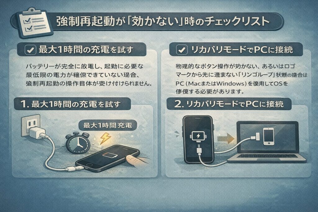 もし強制再起動でも改善しない場合は、バッテリー切れやOSの破損を疑い、充電やリカバリモードによる修復を試みてください。