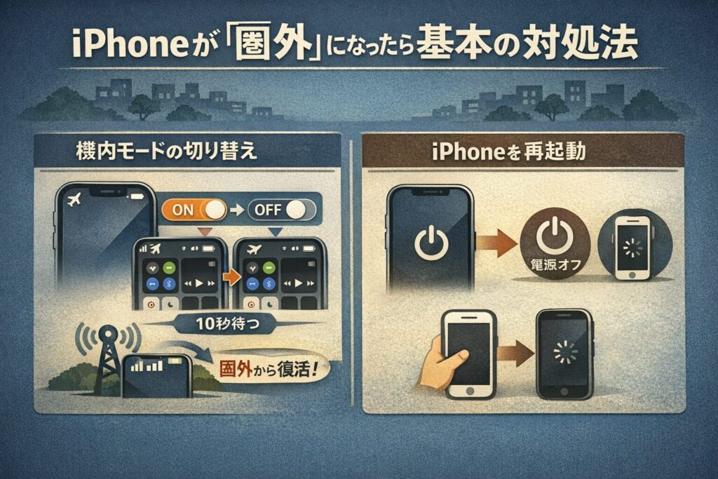 iPhoneが突然圏外になった場合、端末の一時的な不具合が原因であることが少なくありません。