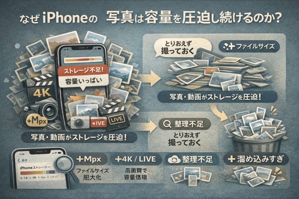 「とりあえず撮っておく」という習慣が積み重なり、整理のプロセスが抜けていることが、容量不足の根本的な原因です。