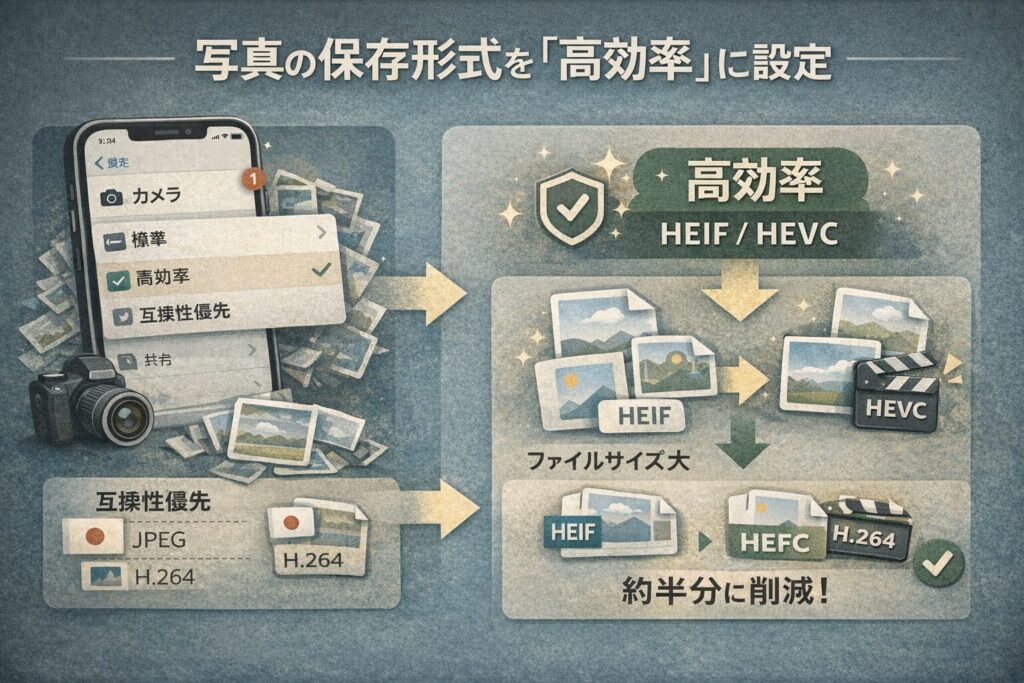 - カメラ設定を「高効率」フォーマットに変更する