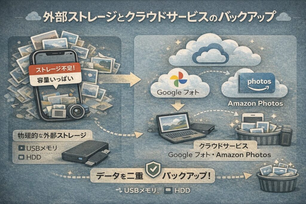 iCloud以外の選択肢として、Google フォトやAmazon Photos(プライム会員なら写真は無制限)へのバックアップも有効です。