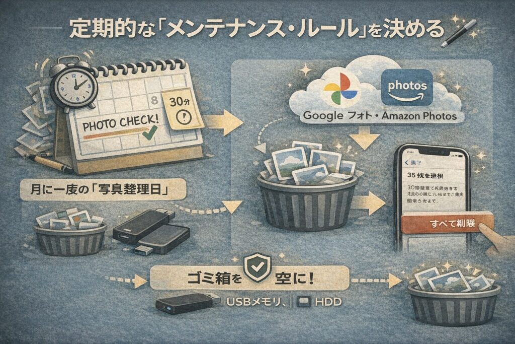 その月に撮った写真を見返し、不要なものを削除し、大切なものはクラウドや外部ストレージへ移動させます。