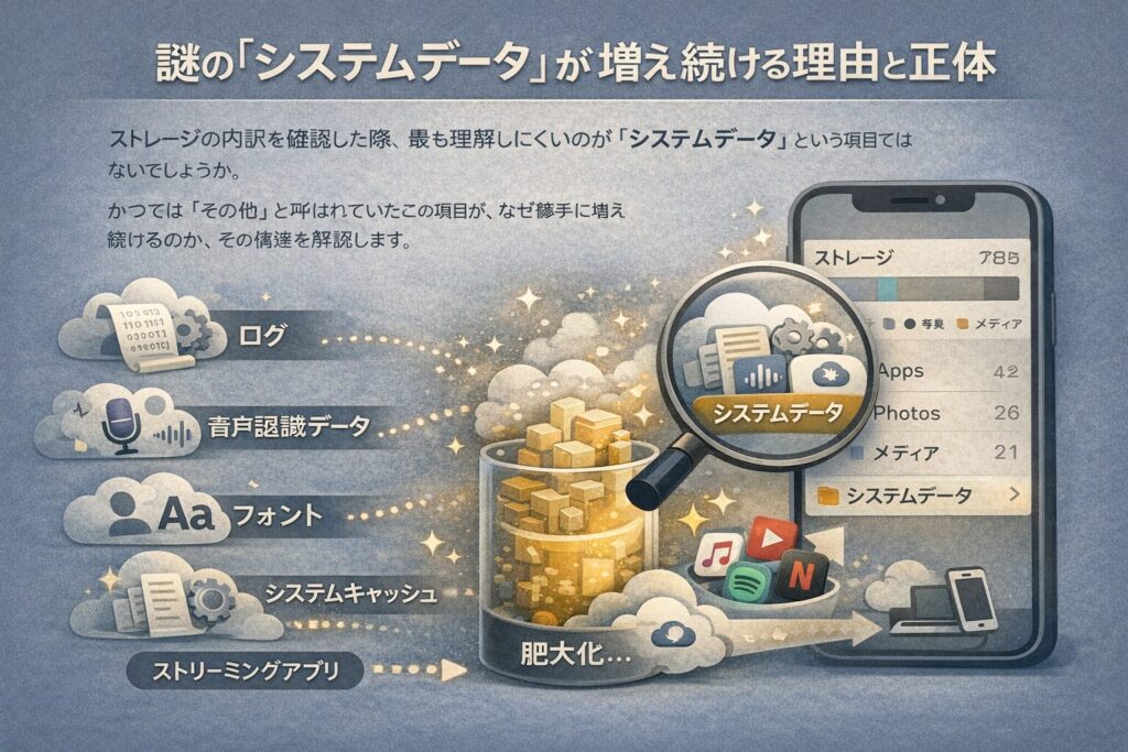 システムデータには、OSが動作するために必要なログファイル、音声認識(Siri)のデータ、フォント、システムキャッシュなどが含まれます。