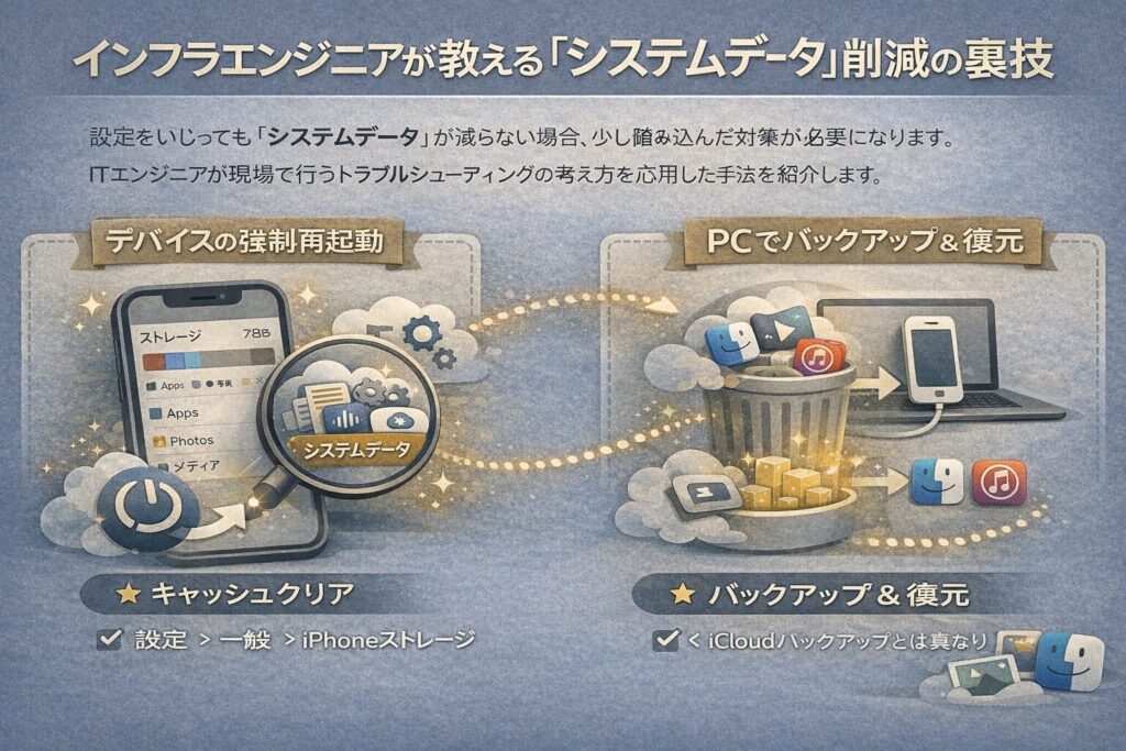 それでも解決しない「システムデータ」の問題には、再起動やPCでの復元といったエンジニアリング的なアプローチが有効です。