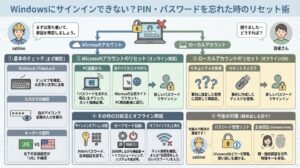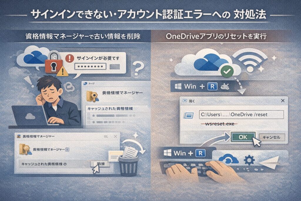 「サインインが必要です」というメッセージが繰り返し表示されたり、正しいパスワードを入力してもログインできなかったりする場合、PC内の認証情報に不整合が起きている可能性が高いです。
