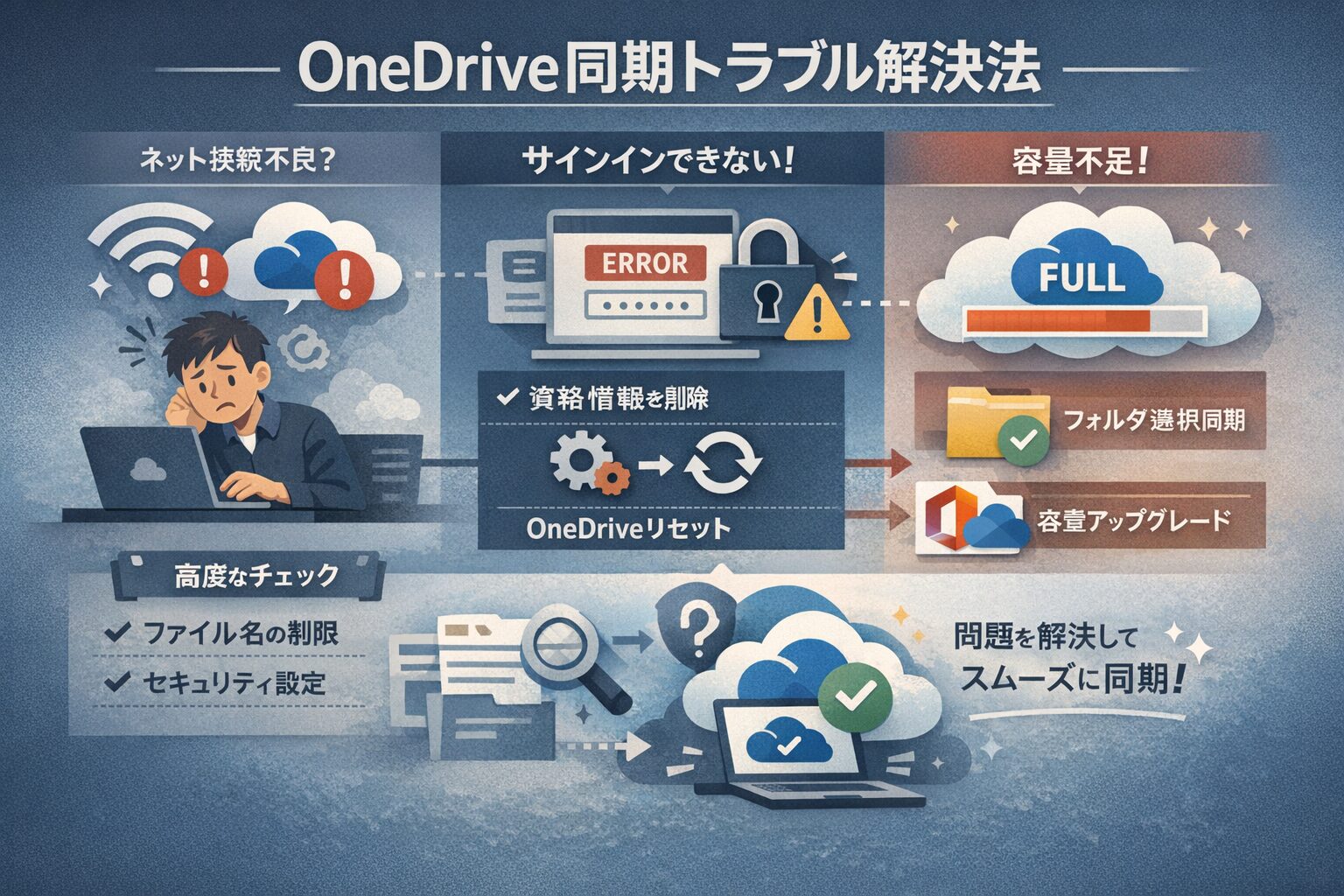 OneDriveの同期トラブルは、ネットワーク、認証、容量、およびファイル設定という4つの観点から切り分けることで、必ず解決の糸口が見つかります。
