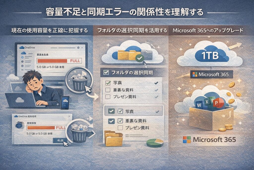 PCのストレージ容量を節約しつつ、同期エラーを防ぐ方法として「ファイル オンデマンド」や「フォルダの選択」機能が非常に有効です。