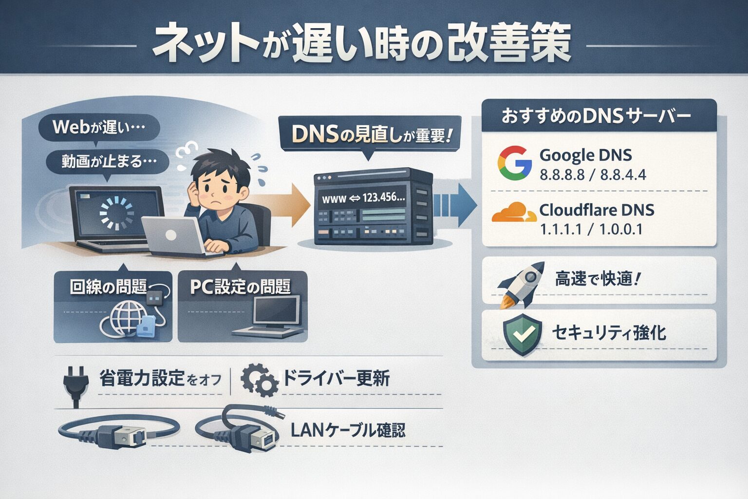 インフラエンジニアとして日々ネットワークの構築や監視に携わっている私の経験から言えば、この現象の多くは「回線そのもの」ではなく、Windowsの設定や「DNS」という仕組みの最適化で改善が可能です。