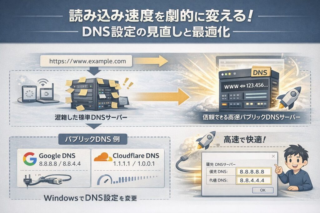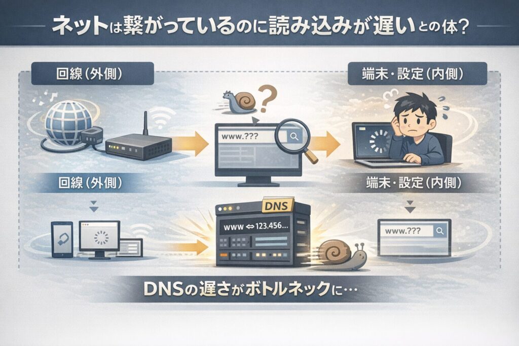 この「遅さ」の正体は、通信の帯域不足だけでなく、Webサイトを表示するための「名前解決」という処理に時間がかかっていることが非常に多いのです。