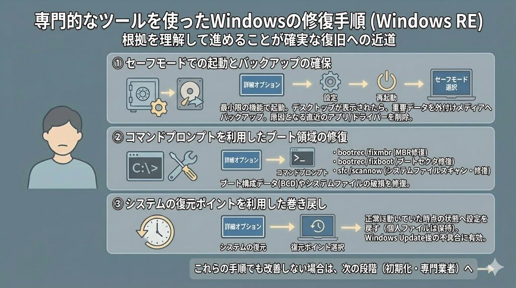 ここからは、Windowsが標準で備えている回復環境(Windows RE)を使用して、システムを正常な状態へ戻す具体的な操作を解説します。