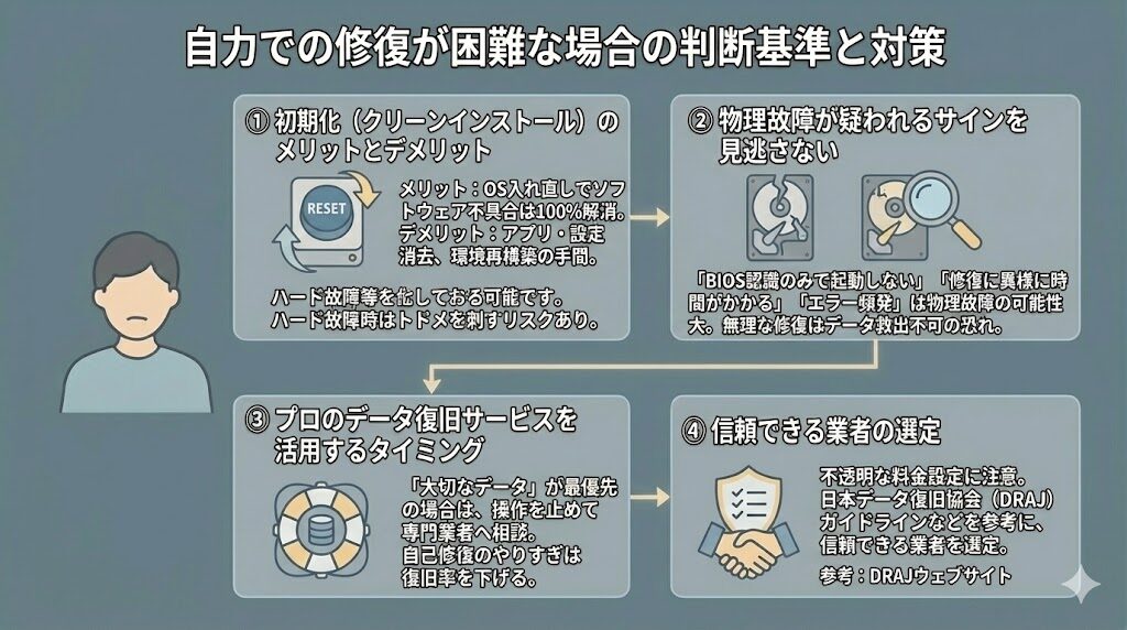 これ以上の自己修復は、状況をさらに悪化させる可能性があるため、慎重な判断が必要です。