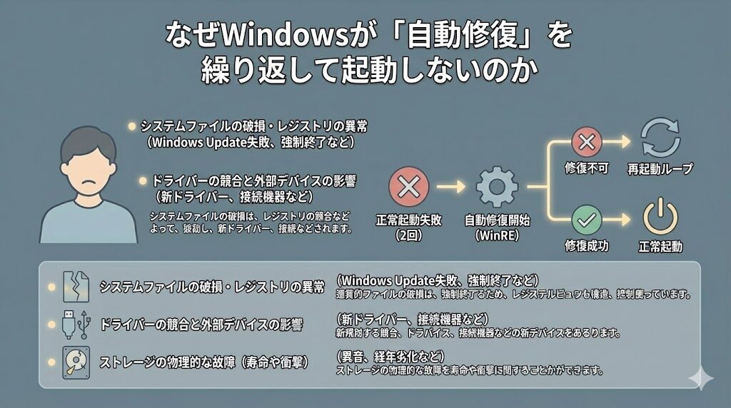 本来であれば便利な機能ですが、修復機能自体が解決できない深刻なエラーが発生している場合、修復と再起動を無限に繰り返す「自動修復ループ」に陥ってしまいます。