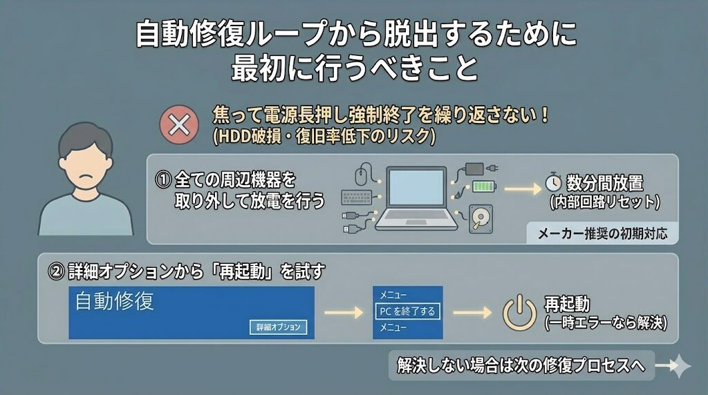 自動修復が失敗した後に表示される「詳細オプション」というボタンをクリックできる場合は、そこから「PCを終了する」を選び、一度完全に電源を落としてみてください。