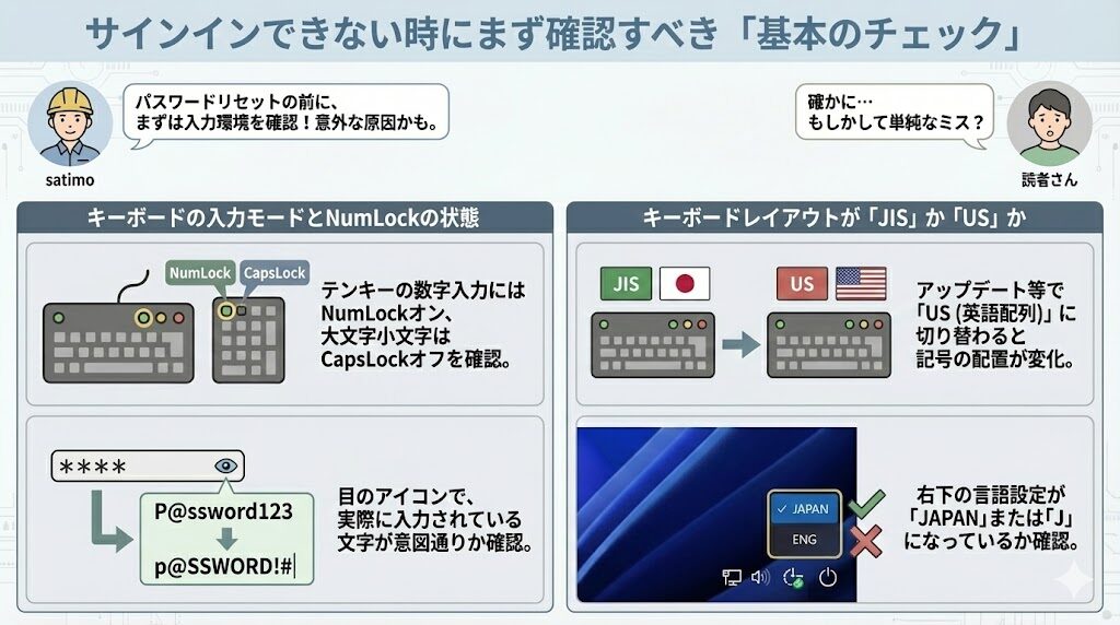 Windowsにサインインできない問題は、パニックにならず、まずは入力環境の基本確認から始めることが鉄則です。
