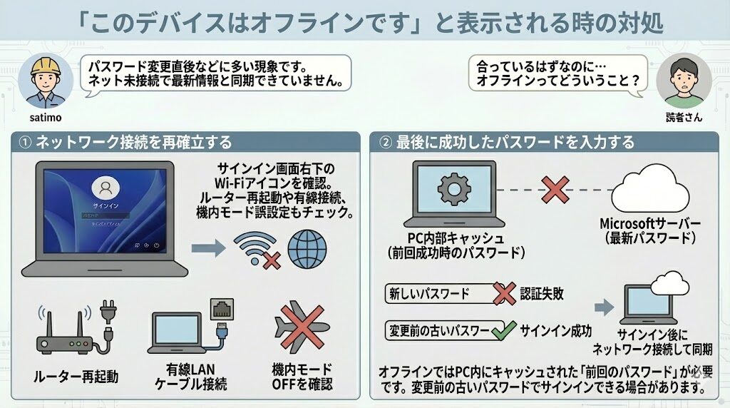 パスワードは合っているはずなのに、「オフラインです。最後にこのデバイスで使用したパスワードでサインインしてください」と表示されることがあります。