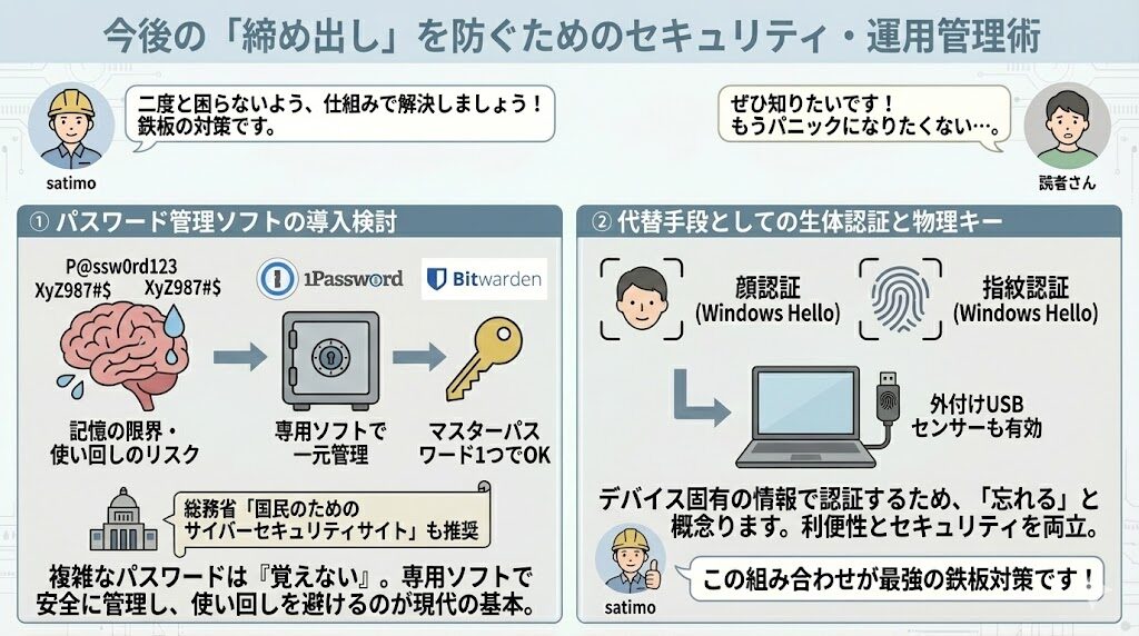 今回のトラブルをきっかけに、パスワード管理の見直しや生体認証の導入を行い、より強固で管理しやすい環境を構築していきましょう。