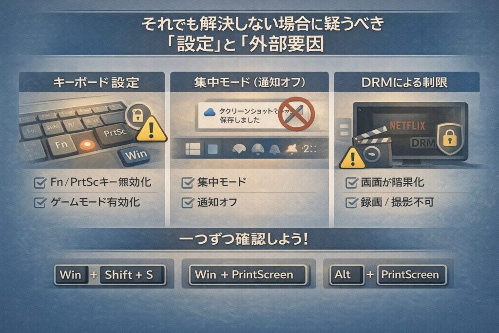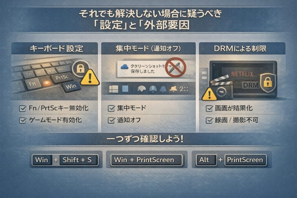 この場合、ショートカットを押しても真っ黒な画像が保存されるか、反応自体がなくなりますが、これはOSの不具合ではなく「保護機能」が正常に働いている結果です。