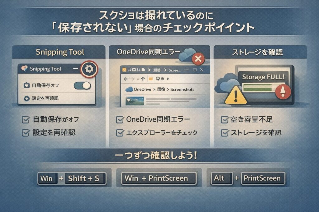 それでも保存されない場合は、Snipping Toolの自動保存設定や、OneDriveの同期状況、ストレージ容量といった「運用の基本」に立ち返ることが大切です。