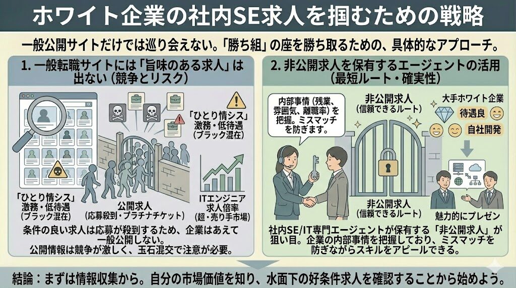 「勝ち組」への最短ルートは、社内SEに特化した、あるいはITエンジニアの転職に強いエージェントが保有する「非公開求人」を紹介してもらうことです。