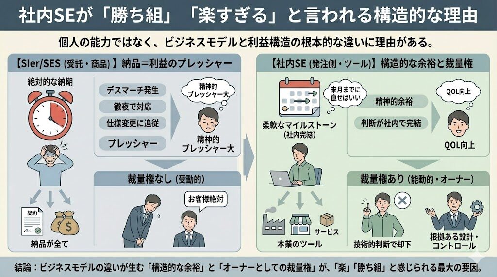 なぜ社内SEは、SIerやSESと比較して「勝ち組」や「楽」と言われることが多いのでしょうか。