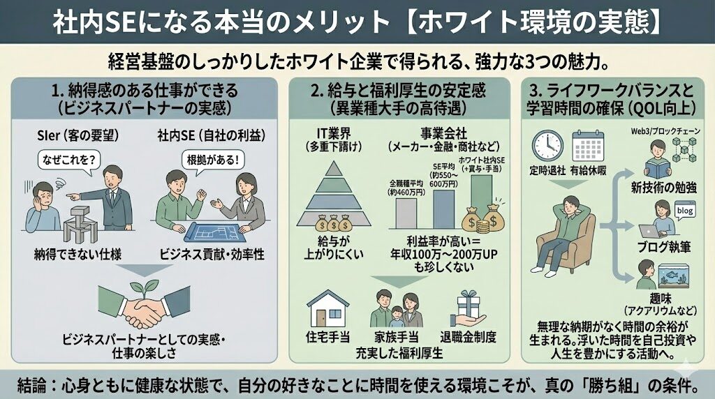 ここまでは実態の裏側をお話ししましたが、やはり社内SEには「勝ち組」と呼ばれるにふさわしい、強力なメリットが存在します。