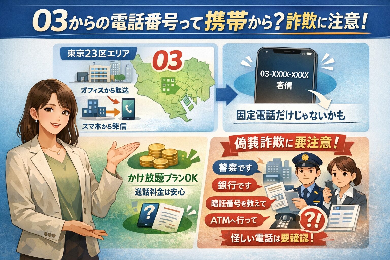 この記事では、03番号の正体から通話料金の仕組み、スマホのかけ放題プランが適用されるかという疑問、さらには近年巧妙化している03番号を悪用した詐欺の見分け方まで、専門的な視点で詳しく解説します。