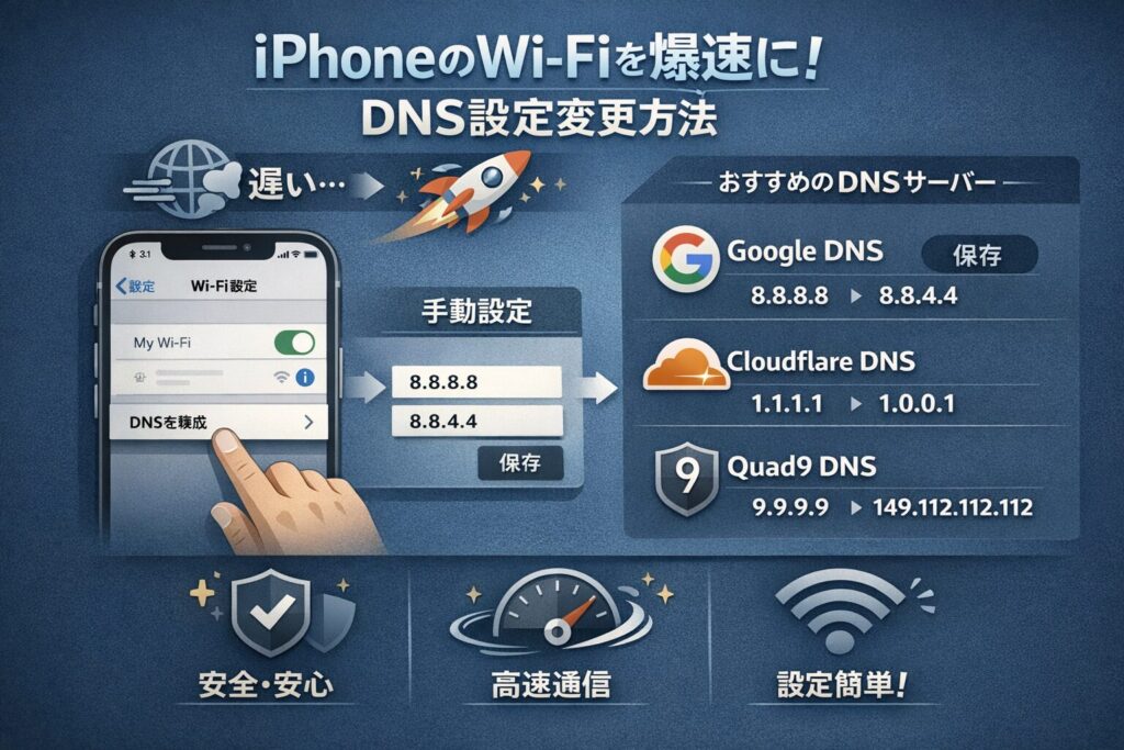 「iPhoneのWi-Fiがなんだか遅い」「Webサイトの読み込みがワンテンポ遅れる」といったストレスを感じていませんか。 実は、iPhoneのWi-Fi設定にある「DNS」という項目を手動で変更するだけで、インターネットの体感速度が劇的に向上する可能性があります。... -